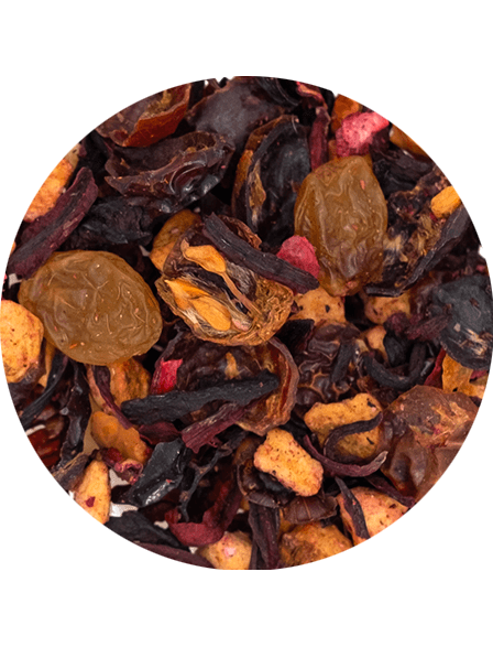 Смесь фруктов на основе гибискуса с изюмом, кусочками яблока, ананасом, плодами папайи, брусникой, со свёклой красной, кусочками малины, ягодами бузины, ароматизирована натуральными маслами. В купаже ароматов этого напитка выделяется благоухание душистого золотисто-медового яблока. Этот аромат сочетается с характерным мягким вкусом малины, терпкостью бузины и благородной кислинкой гибискуса. Тонкая нотка сладкого изюма создает неповторимую композицию, которую оживляет свежесть тропических фруктов.