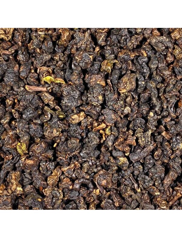 Внешний вид сухого чая: достаточно крупные буро-коричневатые с легким глянцем узелки.
