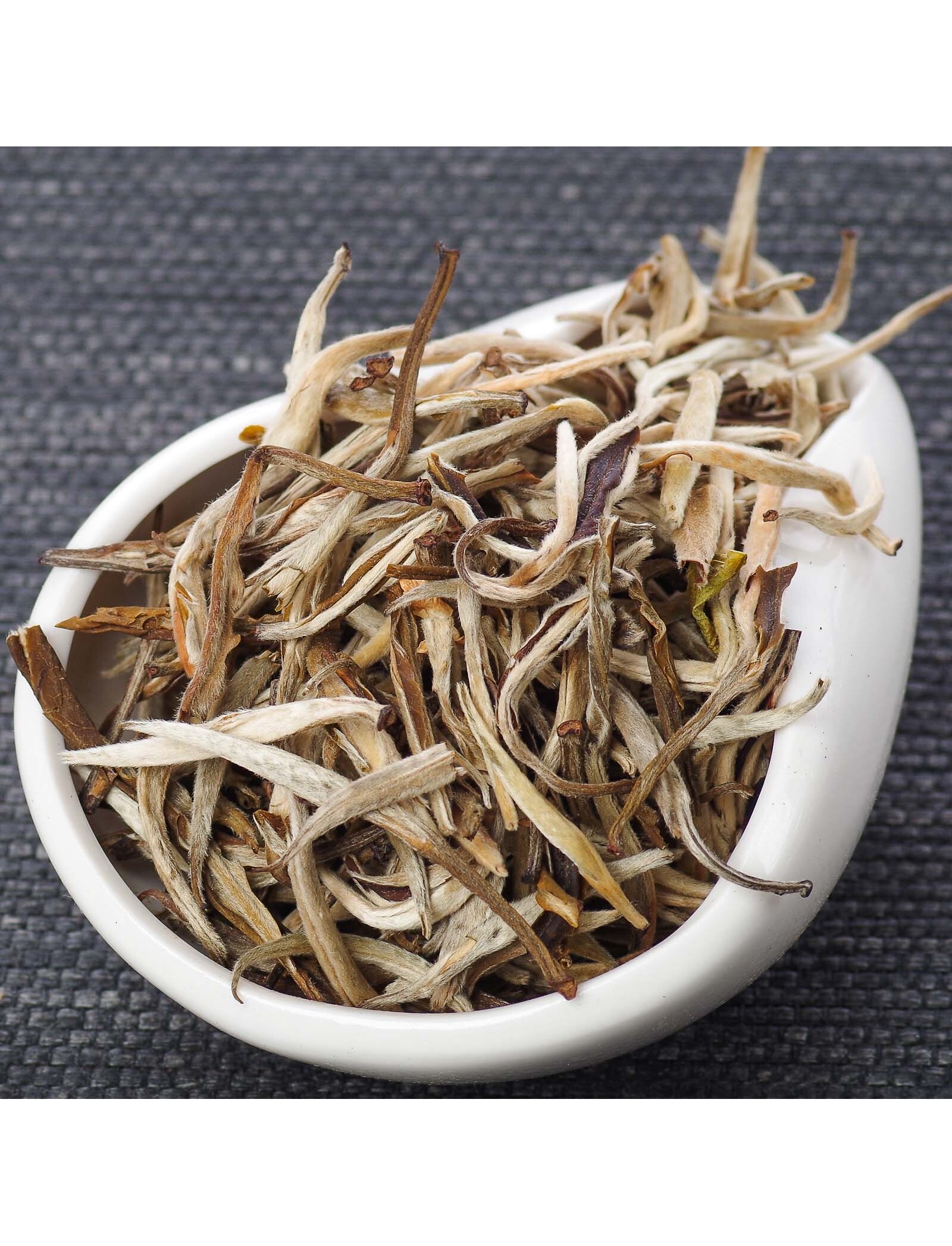 Юньнаньский типсовый Юэ Гуан Бай "Белый лунный свет", прошедший процедуру натуральной ароматизации в соседней провинции Гуанси, где располагаются плантации жасмина. Натуральная ароматизация отличается от искусственной или идентичной натуральной особой шелковистостью и нежностью. Интенсивный и заполняющий жасмин остается при этом тонким, сладким, ванильным. Аромат цветка вместе с нашим обонянием обманывают вкусовые рецепторы. Под таким букетом чай ощущается сладким, хотя физической основы для раздражения рецепторов нет. Под благоуханием разыгрывается воображение, и голова дорисовывает все сама. Неудивительно, что именно жасминовым чаем наложницы соблазняли императоров. Название Ча Ван «Чайный повелитель» дано из-за исключительности сырья - крупной почки, покрытой густым ворсом.