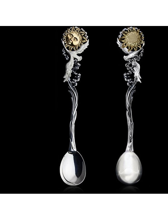 Чайная ложка "День" - это высокохудожественное изделие из серебра 925 пробы (часто с позолотой), которая украшена изображением солнца, символизируя свет, тепло, радость, благополучие и являясь элитным подарком. Этот изящный предмет сможет быть прекрасным подарком по любому поводу: его можно подарить и мужчине, и женщине; ребенку или бабушке. Художественная основа предмета кроется в самом сюжете сказки: при свете дня Василиса превращалась в лягушку, а как придет ночь - скидывала свою шкурку и обращалась в прекрасную царевну. Интересной особенностью этого изделия является удлиненный черенок, который очень удобен при использовании. Технологии при изготовлении: итьё, золочение, оксидирование, гравирование. Материал - серебро 925 пробы. Размер - 169*30*8 мм. Вес изделия - 38 г.