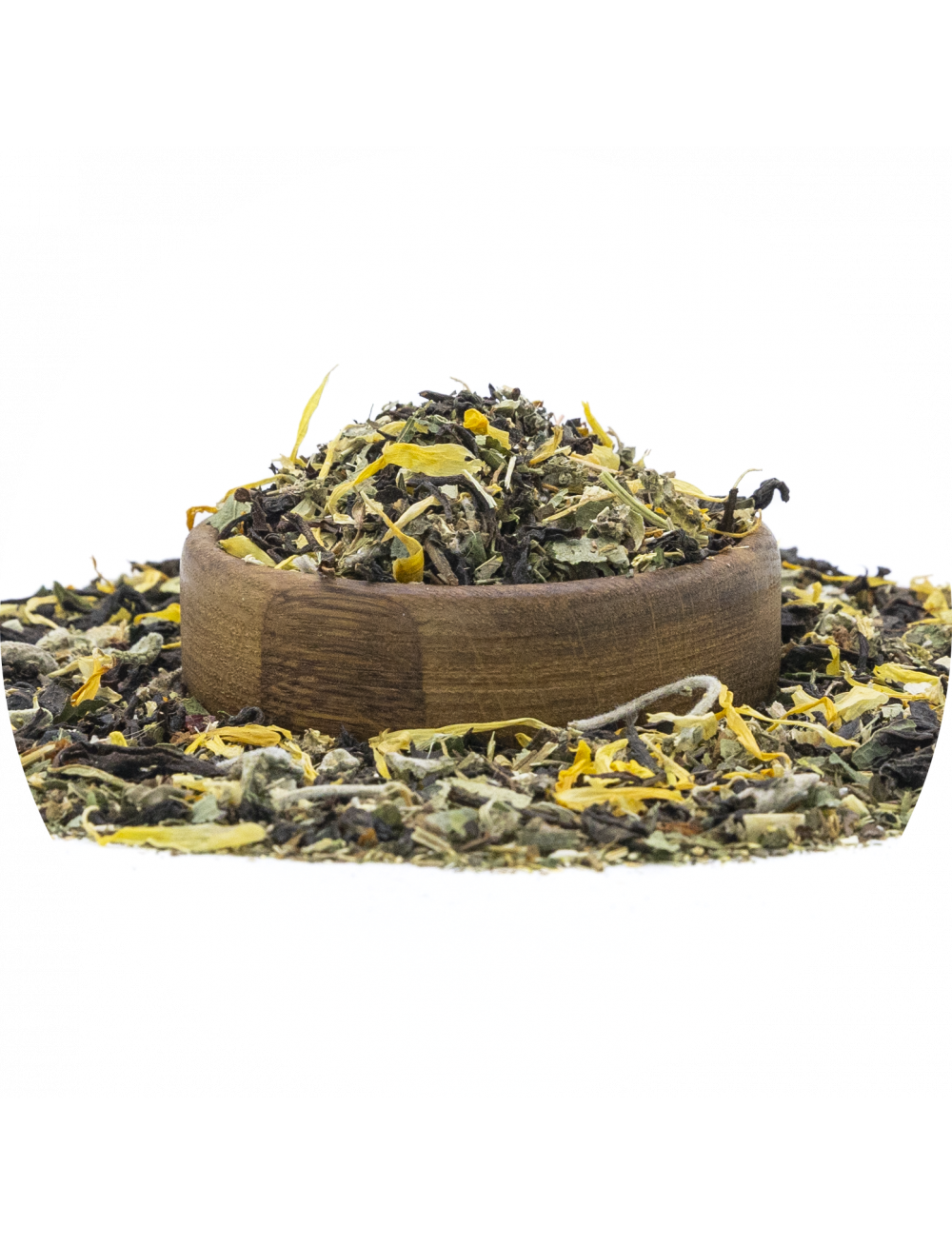 Этот уникальный чайный купаж состоит из черного индийского чая, иван-чая, листа земляники, малины, черной смородины, крапивы, чабреца, мяты, мелиссы, шалфея, кожуры шиповника, цветков ромашки, липы, зверобоя, душицы и лепестков календулы. Вкус чайного напитка насыщенный, с травяными и фруктовыми нотками, что делает его идеальным для любителей натуральных, ароматных чаев.
