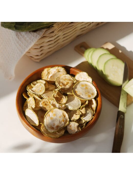 Кабачок содержит множество пищевых волокон, легко усваивается, надолго дает чувство насыщения и мягко стимулирует пищеварение, помогая выводить шлаки, токсины и лишнюю жидкость. Добавив немного натурального чеснока, мы сделали наши чипсы более пикантными и еще более полезными, а щепотка соли усиливает вкусовые ощущения от самого кабачка.