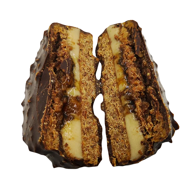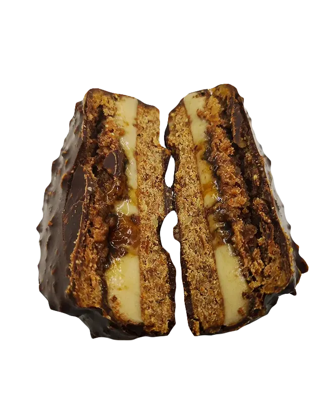 Два миндальных коржа с цитрусовой ноткой мандарина, апельсина и лимона. В центре густая карамель, джем из цитрусовых с кусочками фруктов покрытый темным шоколадом и украшен хрустящей песочной крошкой.