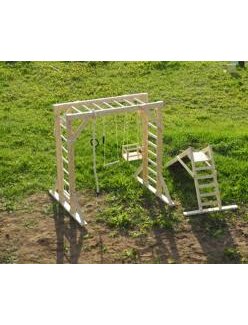 Дачный спортивный комплекс "Калифорния" разработан специально для уличных условий, где много места: для дачи, сада, придомовых территорий. Поставляется в разобранном виде. Дети оценят по достоинству деревянную лазалку на даче. Подходит ребенку любого возраста. Комплектация: шведская стенка с 2-мя перекладинами, рукоход, крепеж, перекладины круглые (диаметр 32 мм.). Высота - 180 см. Ширина - 170 см. (по нижним основаниям). Диаметр перекладин - круглые (3,2 см.). Максимальная нагрузка - 80 кг. Вес - 25 кг. Материал - сосна, береза.