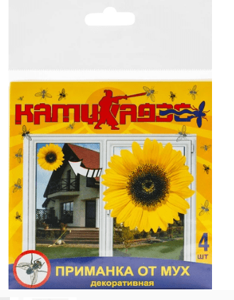 представляет собой цветную самоклеящуюся картинку в форме цветка, на поверхность которой нанесена инсектицидная приманка.