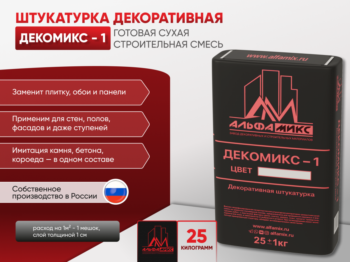 Декоративная штукатурка Декомикс-1 25 кг серая особо пластичная модифицированная смесь на цементной основе, предназначена для придания декоративного эффекта поверхности. Применяется при внутренней и внешней отделке стен зданий и помещений, изготовлении декоративных полов с легкой нагрузкой и малых архитектурных форм.