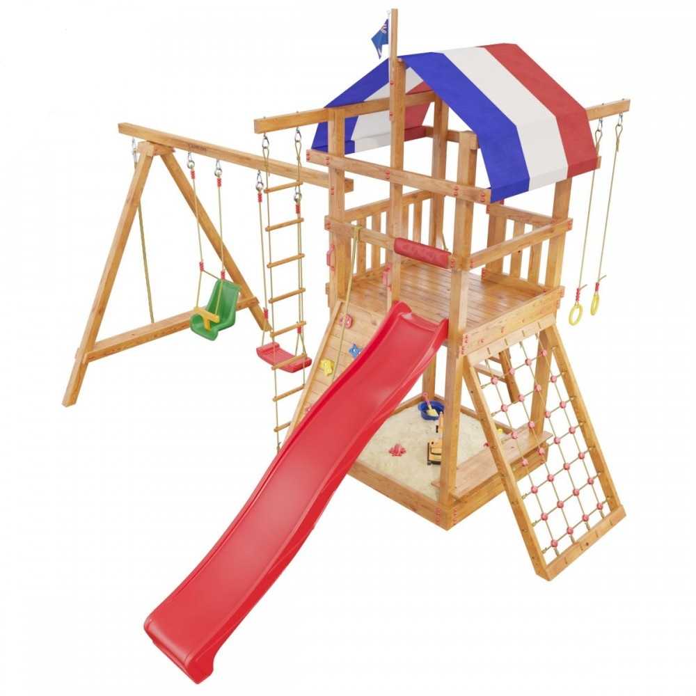 Деревянные детские площадки "ТАСМАНИЯ" - это детская игровая деревянная площадка для дач и частных домовладений, которая предназначена для детей от 4 до 9 лет, и создает условия, обеспечивающие физическое развитие ребенка, развивающие координацию движений, преодоление страха высоты, ловкость и смелость, чувство коллективизма в массовых играх. Каркас изделия изготовлен из клеёного бруса сосны, ограждение и иные элементы из массива сосны. Внешние размеры - 4,8*4,2м., высота - 3,2м., горка, длина ската - 2900-2950м.