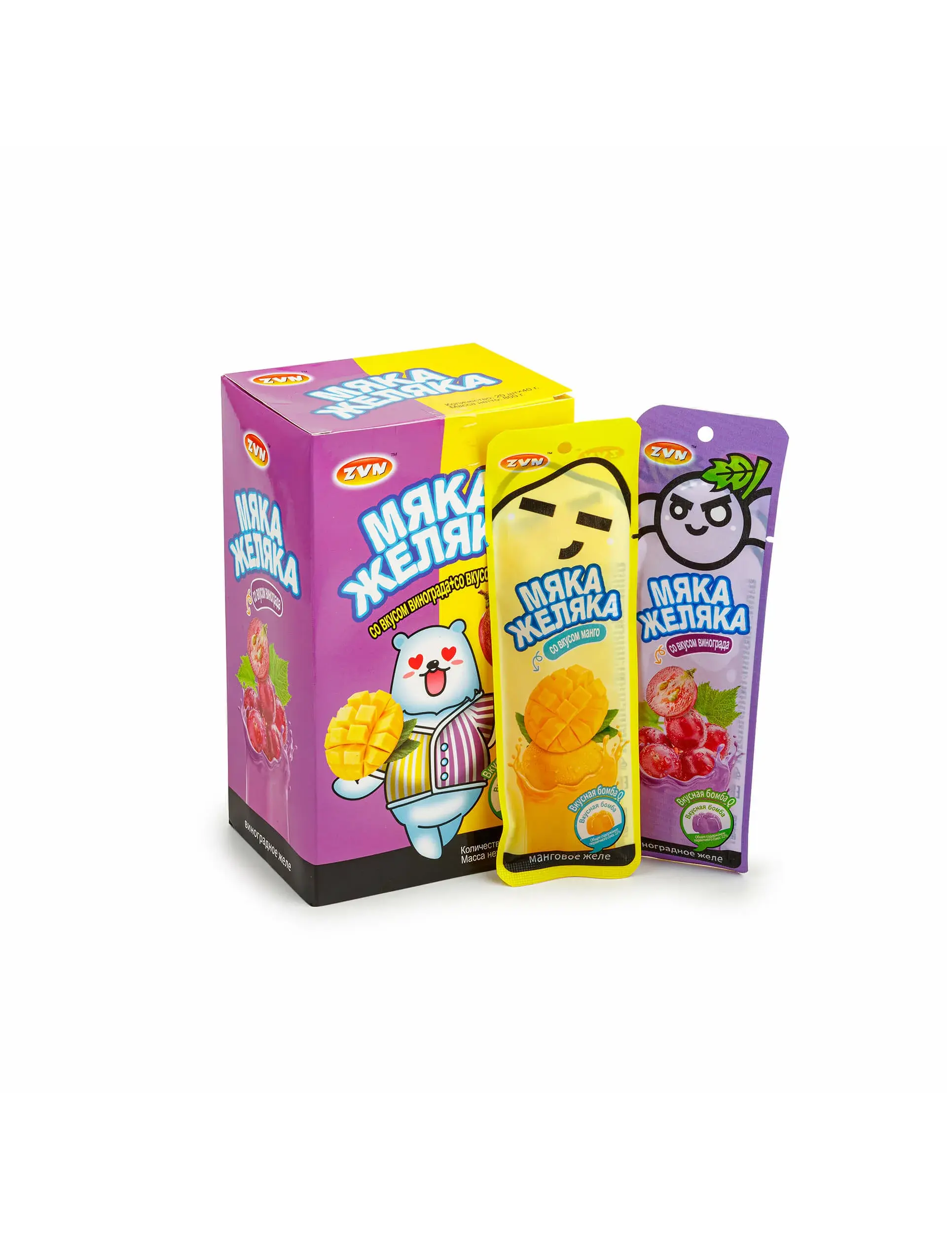 Желейный десерт «Мяка Желяка» со вкусом «Солнечный виноград и манго» — это фруктовое желе от бренда ZVN, сочетающее вкусы винограда и манго. Продукт предназначен для детей и взрослых, удобен для перекуса, в дорогу или в качестве подарка.