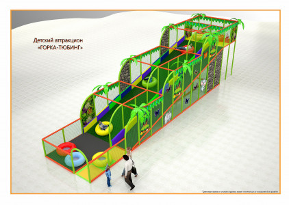 Детский аттракцион Горка-Тюбинг - это специальная горка с покрытием для круглогодичного использования для катания на тюбингах (ватрушках), которые представляют собой надувные, круглые, мягкие санки с ручками, обеспечивая веселое и безопасное скольжение для детей и взрослых, имитируя катание по снегу или льду. Это развлечение предназначено для получения адреналина, скорости и удовольствия, спуск на которых безопасен благодаря специальной конструкции и контр-уклонам, а тюбинги можно брать в прокат. Длина горки - 16.9 метров, ширина - 15.3 метра и высота - 5 метров. Предназначена для детей от 3-х лет.