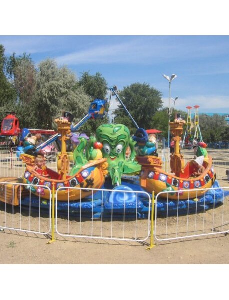 Детский аттракцион "Корсар" - это тематические качели или карусель, оформленные в виде пиратского корабля, предназначенные для активного отдыха детей. Аттракцион имитирует плавание по волнам, взмывая ввысь и опускаясь вниз, что развивает вестибулярный аппарат, стимулирует воображение и дарит эмоции. Количество посадочных мест - 8 человек. Скорость вращения платформы - 6 об/мин. Длина - 10,7 м. Ширина - 9,3 м. Высота - 5 м. Занимаемая площадь - 70 кв. м.