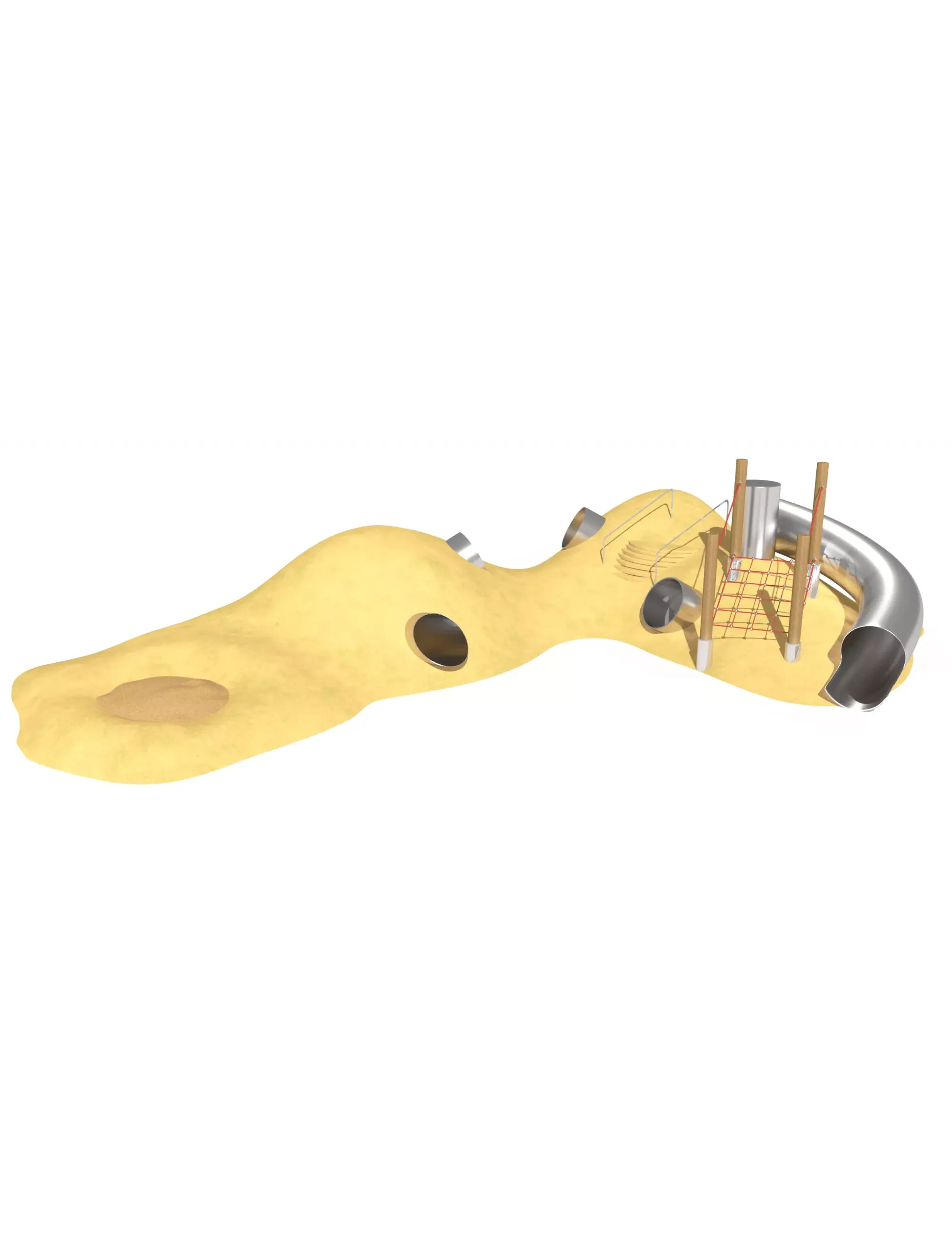 Детский игровой комплекс Геопластика - это современная площадка, где искусственно создают рельеф (холмы, горки, тоннели, террасы), покрывая его травмобезопасными материалами (резиновой крошкой) для формирования уникального, объемного и функционального игрового пространства, стимулирующего физическое развитие, координацию и воображение детей, в отличие от плоских стандартных площадок. Площадка рассчитана на возраст - от 6 до 12 лет. Материалы - нержавеющая сталь, столбы - деревянные. Длина - 12,4 м. Высота - 2,8 м. Ширина - 8,2 м.
