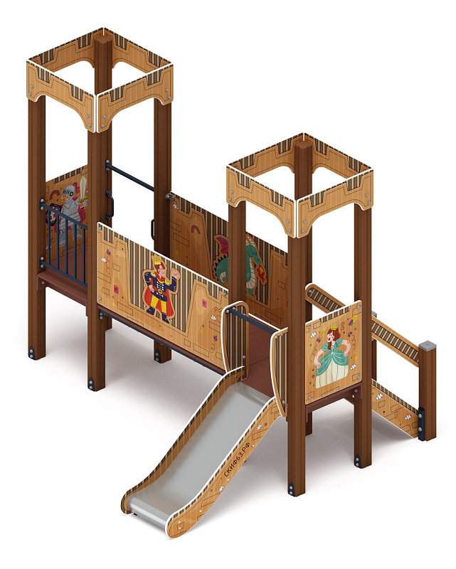 Детский игровой комплекс Королевство (Картонное) - это тематический уличный игровой комплекс для детей, имитирующий сказочный замок или крепость, выполненный с "картонной" расцветкой и дизайном, предназначенный для активных игр, развития моторики, социализации и организации досуга на детских площадках во дворах или парках, сочетающий элементы лазания, горок и фортов для увлекательного и полезного времяпровождения.Габариты - 3100*2670*2650 мм. Зона безопасности - 6100*6170 мм. Высота падения - 750 мм. Возрастные ограничения - от 3 до 7 лет, весом не более 70 кг.