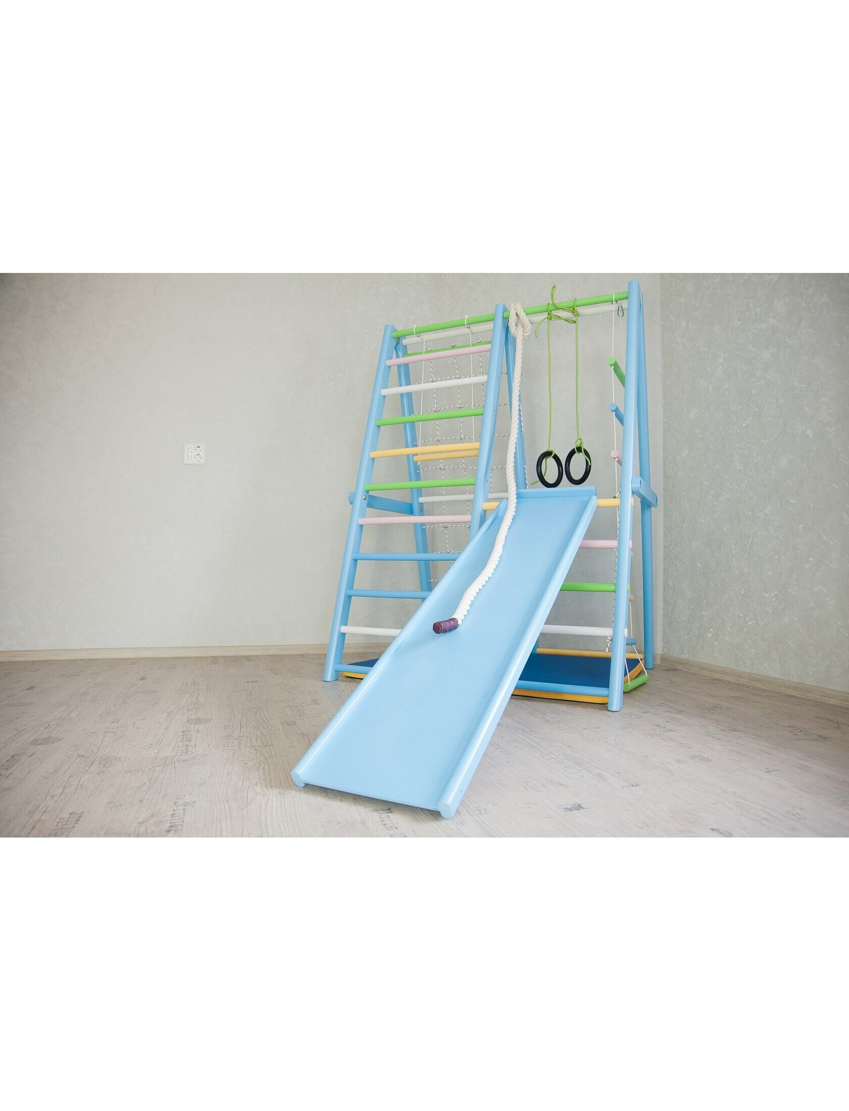 Детский спортивный комплекс Добрыня Стандарт разработан специально для небольших детских комнат и предназначен для детей от 0 до 6 лет. Легко собирается и может складываться при необходимости. Комплектация: шведская стенка, веревочная секция(пиратская), канат х/б - 1.5м (толщина 3 см.), трапеция. Высота - 170 см. Длина - 106 см. Ширина - 129 см. Веревка - синтетическая. Диаметр перекладин - круглые (3,2 см.). Максимальная нагрузка - 60 кг. Материал - сосна, береза, экологичный лак. Крепеж поставлется в комплекте.