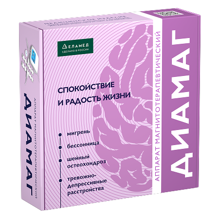 ДИАМАГ (АЛМАГ-03) - это медицинский аппарат для лечения и профилактики головных болей, депрессивных и тревожных расстройств, нарушений сна. Действующий фактор аппарата ДИАМАГ - низкоинтенсивное импульсное магнитное поле. Оно способствует нормализации тонуса сосудов головного мозга, а также их "тренировке", что дает возможность прекращать мигренозные атаки и в дальнейшем уменьшать их интенсивность практически без побочных явлений. Магнитное поле аппарата ДИАМАГ способствует также нормализации выработки гормонов адреналина, кортизола, мелатонина и серотонина, тем самым позволяя снижать тревожность, подавленность, перепады настроения и улучшать качество сна.