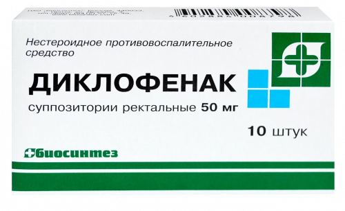 Диклофенак - это ректальные, высокоэффективное, нестероидное, противовоспалительное средство (НПВП), производное фенилуксусной кислоты. Он применяется для купирования боли, снятия воспаления и уменьшения отечности при заболеваниях суставов, мышц, травмах, а также в постоперационном периоде. Диклофенак в форме суппозиториев - это свечи цилиндроконической формы, белого или белого с кремоватым оттенком цвета. Дозировка - 50 мг действующего вещества (диклофенак натрия) в каждом суппозитории. Упаковка - пачка из картона, в количестве 10 штук.