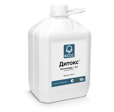 Преимущества Незамедлительное действие. Широкий спектр действия. Продолжительное системное действие. Механизм действия Контактно-кишечный инсектицид нейротоксического действия. Обладает быстрым системным и контактным действием. Высокоэффективен против грызущих и сосущих вредных насекомых и клещей. В организме вредителей препарат действует на нервную систему и вызывает угнетение дыхания и сердечной деятельности, паралич и смертельный исход. Скорость воздействия Высокая – на уровне большинства фосфорорганических инсектицидов и акарицидов. Действие препарата на вредителя проявляется через 3-5 часов после проведения обработки. Период защитного действия Период защитного действия 14 - 21 день. Спектр действия Хлебная жужелица, клоп вредная черепашка, пьявица, внутристеблевые мухи, тли, трипсы, бобовая огневка, гороховая плодожорка, щитовки, ложнощитовки, клещи, листовертки, медяница, моли, плодожорка, листогрызущие гусеницы, жуки, клопы, листовая тля, минирующая муха и моль, цикадки, мертвоеды, блошки, картофельная моль, люцерновая толстоножка, листогрызущие гусеницы, жуки, клопы, листовая тля, минирующая муха и моль, цикадки, мертвоеды, блошки, картофельная моль, люцерновая толстоножка, совка-гамма, галлицы и др. Возникновение резистентности Для предотвращения возникновения устойчивости к препарату Дитокс необходимо чередовать с инсектицидами из других химических групп. Фитотоксичность Не токсичен в рекомендуемых нормах применения. Совместимость Совместим с большинством применяемых фунгицидов и инсектицидов, за исключением щелочных и серосодержащих. Рекомендации по применению Препарат устойчив к повышенной температуре воздуха, интенсивному солнечному излучению и пониженной влажности воздуха. В зависимости от появления новых видов вредителей, рекомендуется одно или два опрыскивания за сезон. Селективность Не селективен.