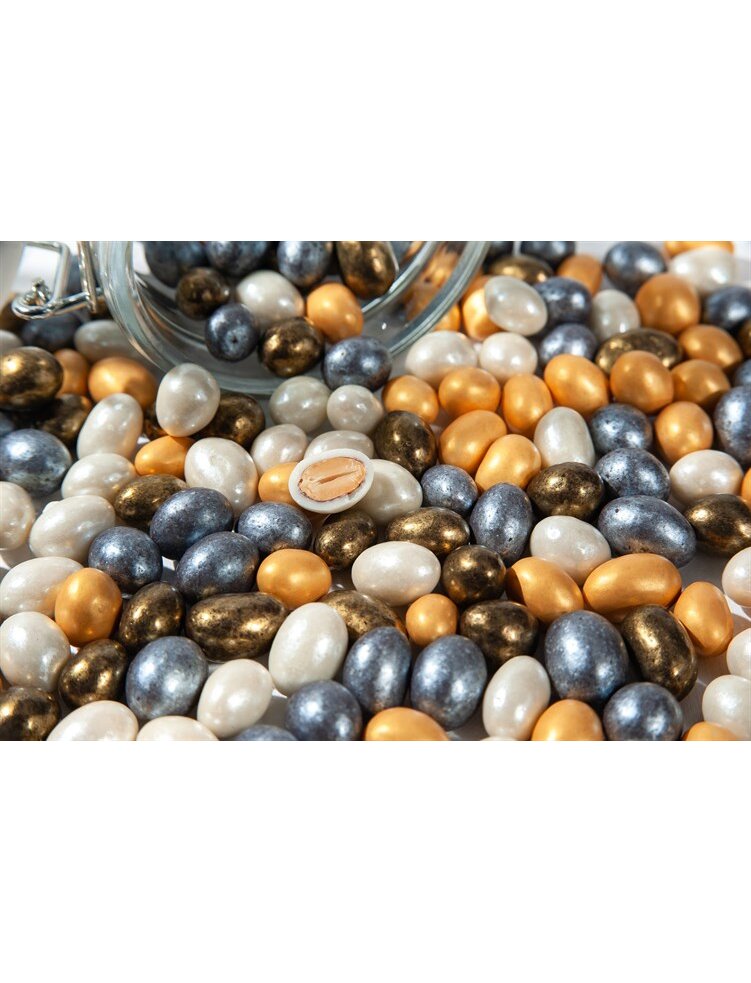 Состав: эмульгатор (лецитин соевый, Е492), ароматизатор - "Ванилин", "Шоколад горький"), белая жировая глазурь (сахар, заменитель масла какао лауринового типа, молоко цельное сухое, сыворотка молочная сухая, кокосовое масло, (лецитин соевый, Е476), ароматизаторы - "Ванилин", "Сливки"), ядро арахиса жареное, пищевые пигменты - серебро, золото, глянец - комплексная пищевая добавка “Капол”