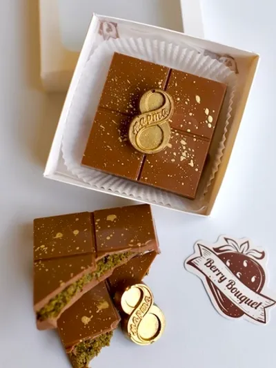 Состав: молочный бельгийский шоколад Callebaut, натуральная фисташковая паста, хрустящее тесто катаифи, дробленая фисташка, кандурин.