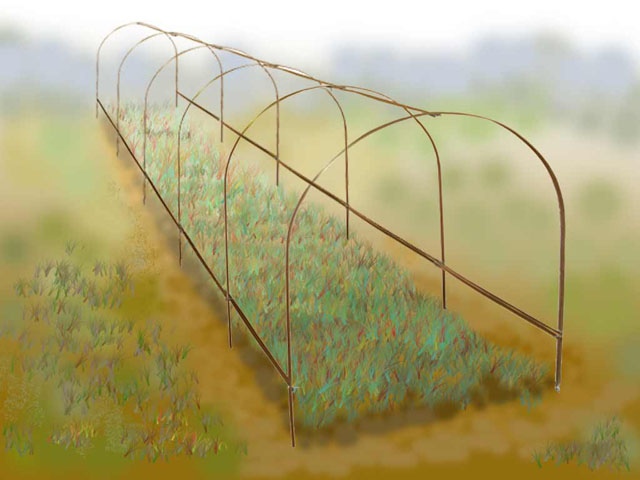Дуговой парник арочной формы изготовлен из оцинкованной стали толщиной 0,8 миллиметра, в отличие от теплицы из поликарбоната. Предназначен для выращивания огурцов, салатов, не крупных корнеплодов, кабачков и пр. Чтобы покрыть дуговые парники поликарбонат сотовый может не подойти, рекомендуется использовать пленку. Поликарбонат сотовый лучше использовать для покрытия теплиц.