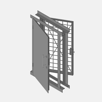 Дверь выполнена в блоке, состоящем из металлической двери и решетчатой двери. Дверь металлическая состоит из наружного стального листа толщиной 3 мм и внутреннего толщиной 2 мм, усиленного по периметру и диагоналям стальным уголковым профилем 50х50х5 мм, а также оборудована приспособлением для опечатывания. Дверь обрамлена стальным коробом из уголкового профиля 100х100х10 мм. Дверь решетчатая состоит из каркаса выполненного из стального уголкового профиля 50х50х5 мм с закрепленными на нем стальными прутками диаметром 16 мм, образующие в перекрестии ячейку размером 150х150 мм, который также привариваются для усиления по периметру и диагоналям. Прутки приварены к каркасу и сварены между собой в каждом сочленении. Дверь обрамлена стальным коробом из уголкового профиля 100х100х10 мм. Между собой короб металлической двери и решетчатой двери соединяются при монтаже полосовым профилем сечением 100 х 5 мм( не менее 10 шт. по периметру).