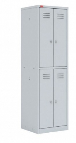 Шкаф разборный металлический двухсекционный с 4-мя отделениями, в стандартную комплектацию каждого отделения входят перекладина для вешалки крючки для одежды, врезной замок. Полимерное порошковое покрытие светло-серого цвета (RAL 7035).