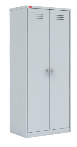 Шкаф разборный металлический двухсекционный, для хранения сменной одежды и документов. 1-я секция: полка для головного убора, перекладина для вешалки и крючки для одежды, врезной замок. 2-я секция: четыре регулируемые по высоте полки, врезной замок. Возможна установка регулируемых опор (в комплект не входят). Полимерное порошковое покрытие светло-серого цвета (RAL 7035).