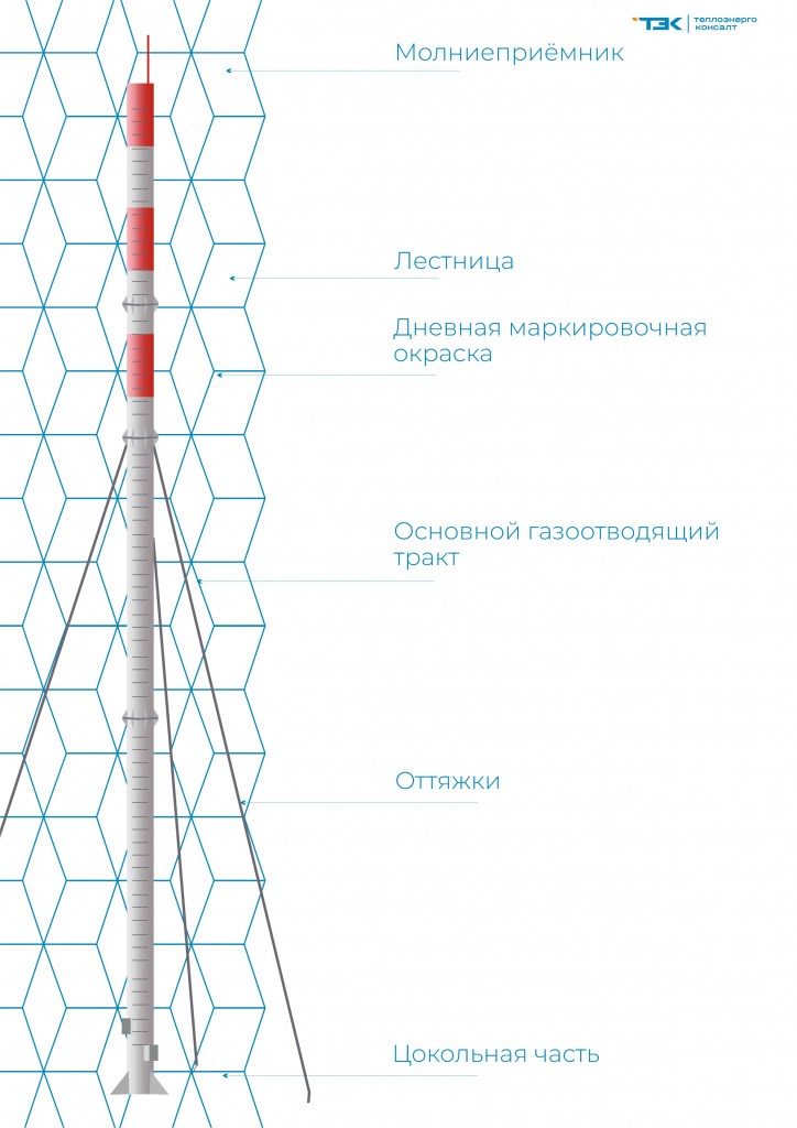 Дымовая труба на растяжках — это свободностоящая труба, предназначенная для удаления продуктов сгорания и забора воздуха, подключаемая к установкам через газоходы. Она укрепляется стальными тросами-растяжками диаметром 16-25 мм, количество которых зависит от высоты и места установки. Тросы и ребра жесткости обеспечивают устойчивость и прочность. Основание трубы монтируется на фундамент или стальной цоколь. Антикоррозионная защита делает трубу устойчивой к высоким температурам и кислой среде. Диаметр трубы рассчитывается на основе максимальной нагрузки. В стандартной комплектации труба не утеплена, но может быть утеплена минеральной ватой по требованию.