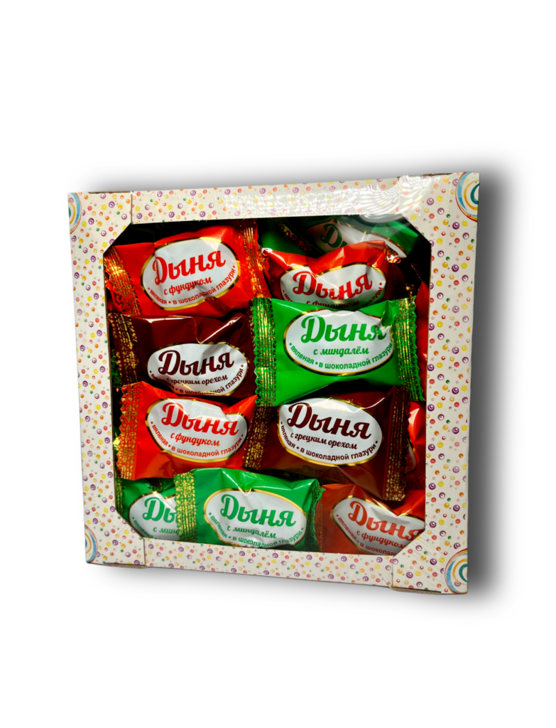 Глазурь кондитерская (заменитель какао-масла лауринового типа, какао-порошок, эмульгаторы Е322, Е476, ароматизатор «Ванилин», дыня вяленая, ядро грецкого ореха, ядро миндаля обжаренное, ядро фундука обжаренное.