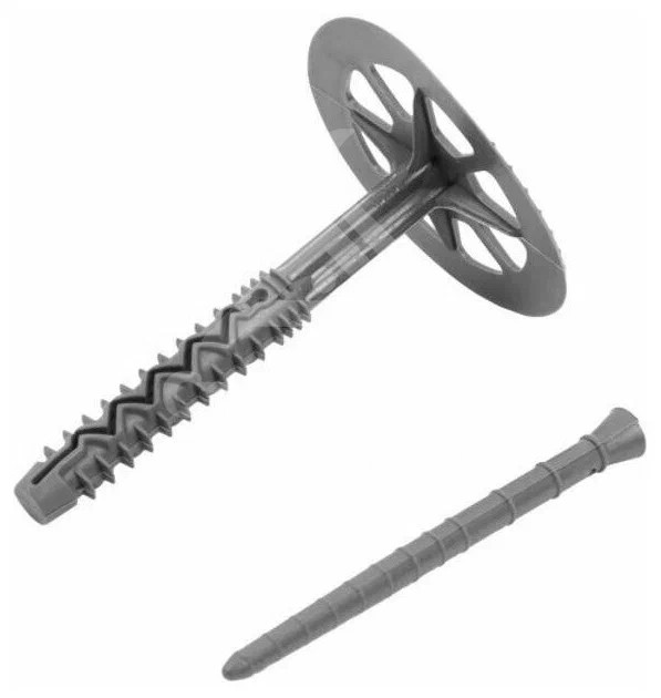 Дюбель для теплоизоляции с пластиковым гвоздём размером 10×90 мм используется для крепления теплоизоляционных материалов толщиной до 150 мм к бетонным основаниям, кладке из полнотелого, силикатного и пустотелого керамического кирпича, ячеистому бетону. Он состоит из двухсегментной распорной зоны и увеличенной прижимной шайбы диаметром 60 мм.