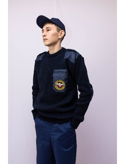 Джемпер полушерстяной мужской выполнен из полушерстяной пряжи ( 30 % шерсть, 70 % ПЭ)Накладной карман (из курточной ткани) на левой полочке. Застегивается на тесьму-липучку. Рукав на манжете. Накладки расположены в плечевой части и выполнены из курточной ткани. Погон на тесьме-липучка.