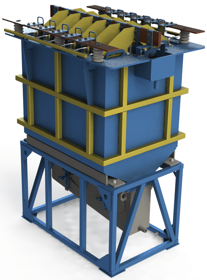Разработана конструкция проточного электролизера ЭТС-10ПП предназначенного для осаждения золота и серебра из щелочно-цианистых растворов на предприятиях использующих угольно-сорбционную технологию извлечения благородных металлов и технологию цианирования гравиконцентратов.
