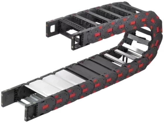 Энергоцепь MP 82.2/3 представляет собой систему из шарнирно соединённых звеньев, которая образует гибкий, но прочный канал для укладки и защиты кабелей и шлангов, подведённых к подвижным частям механизмов.
