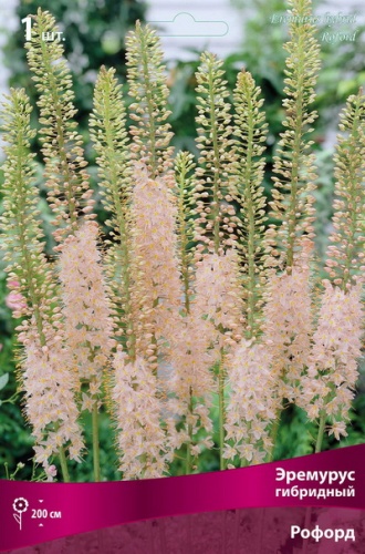 Эремурус гибридный Рофорд оригинальный корневищный многолетник высотой от 50 см до 3 м. Листья длинные, собраны в прикорневую розетку. Стебли безлистные, высокие, заканчивающиеся крупным кистевидным соцветием некрупных цветков. Цветет в июне-июле до 30 дней. Цветки светло-розове, высота растения 200 см. Хорошо смотрятся в одиночной и групповой посадке. Некоторые виды дают прекрасную срезку.