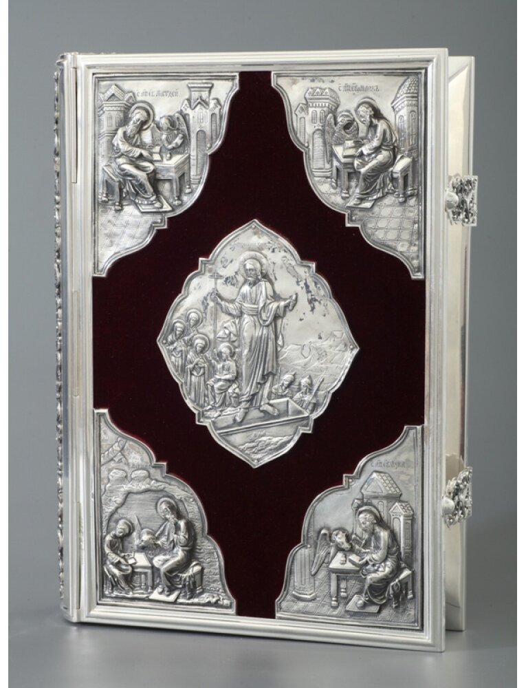 Евангелие гальванопластика, литье серебро - это создание художественного оклада или элементов книги путём электрохимического осаждения слоя серебра на форму, обеспечивающее высокую точность детализации. Этот метод позволяет получить рельефный, долговечный и эстетичный серебряный декор (оклады, застежки). Материалы основные - серебро, бархат. Покрытие - чернение. Техника исполнения/отделка - гальванопластика, литьё. Длина - 360 мм. Ширина - 240 мм. Высота - 115 мм. Вес брутто - 10,8 кг. Вес нетто - 9 кг. Упаковка - футляр.