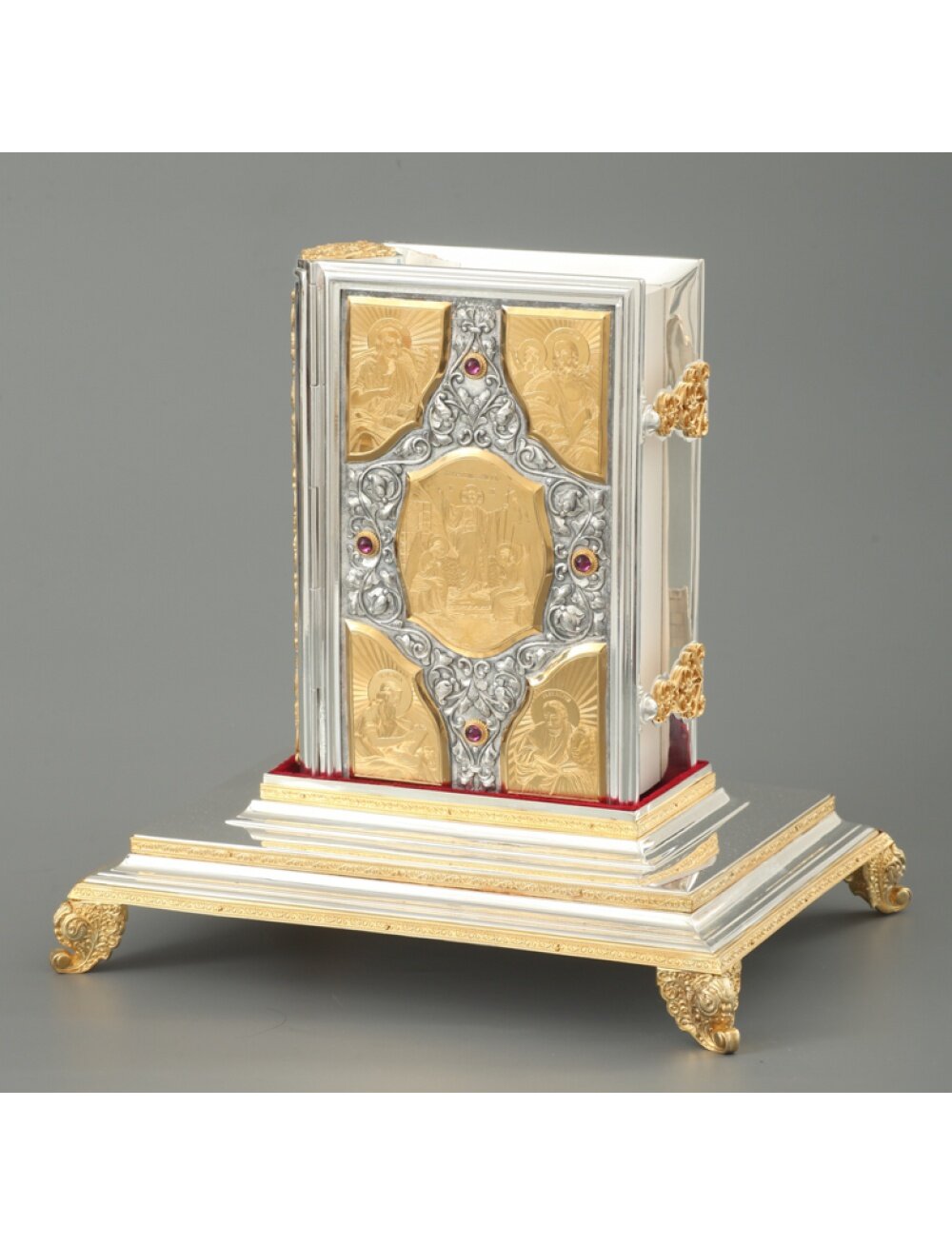 Евангелие требное - это богослужебная книга малого формата для совершения треб (крещение, соборование, посещение больных). Оно используется священниками вне храма для удобства переноски, а драгоценная отделка подчеркивает значимость Священного Писания. Подобные книги часто приобретают для храмов или в качестве ценного подарка духовенству. Применяется комбинация серебрения (основа) и золочения (детали), что придает изделию торжественный вид. Длина - 320 мм. Ширина - 320 мм. Высота - 110 мм. Вес брутто - 9,7 кг. Вес нетто - 8 кг. Упаковка - футляр.