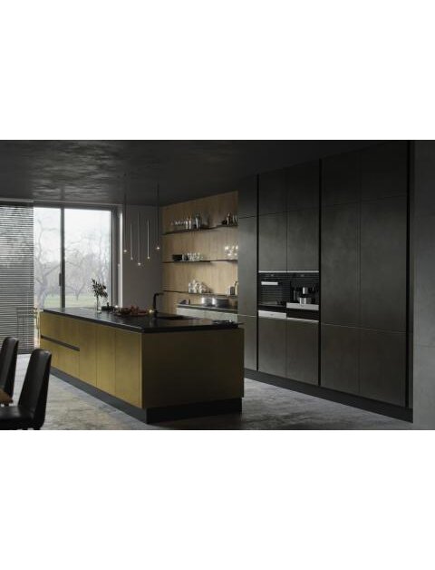 Монохромный графитовый цвет дополняет динамичный и цельный образ. Инновационная отделка фасадов с имитацией неотполированного металла подчеркивает стиль каждой линии. Фасады отличаются асимметричностью, но задуманной, — все находится в визуальной гармонии. Дизайнерские элементы делают стиль нетривиальным — дверцы шкафов с узорчатым стеклом, фартук кухни из акрилового камня. Модные стеклянные и металлические поверхности создают ощущение легкости. При этом они и красивы, и обладают высокой прочностью, практичны и просты в уходе.