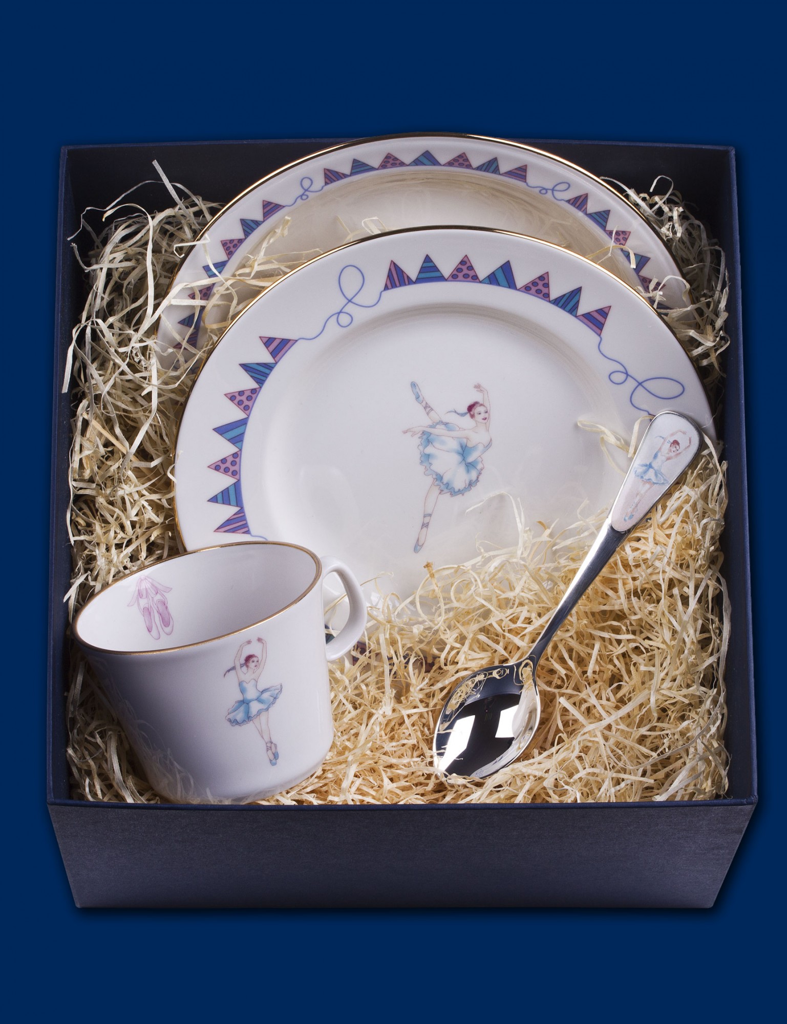 Фарфоровый набор "Нежный возраст. Балерины" - это изысканный и утонченный набор, который является хорошим подарком на рождение ребенка, крестины, день рождение и любой другой праздник. Борт тарелок украшен изображением флажков. В центре тарелок, по бокам чашки и на ручке ложечки изображены балерины. Также на внутренней стороне чашки рисунок пуант. Обводка тарелок и чашки - позолота. Изысканный и утонченный набор "Нежный возраст. Балерины" продается в подарочной коробке. Материал посуды - фарфор. Материал приборов - серебро 925 пробы. Состав набора - глубокая тарелка, плоская тарелка, чашка, ложечка. Размер коробки - 22*22*15 см. Размер плоской тарелки - 18 см. Размер глубокой тарелки - 18 см. Объем чашки - 180 мл.