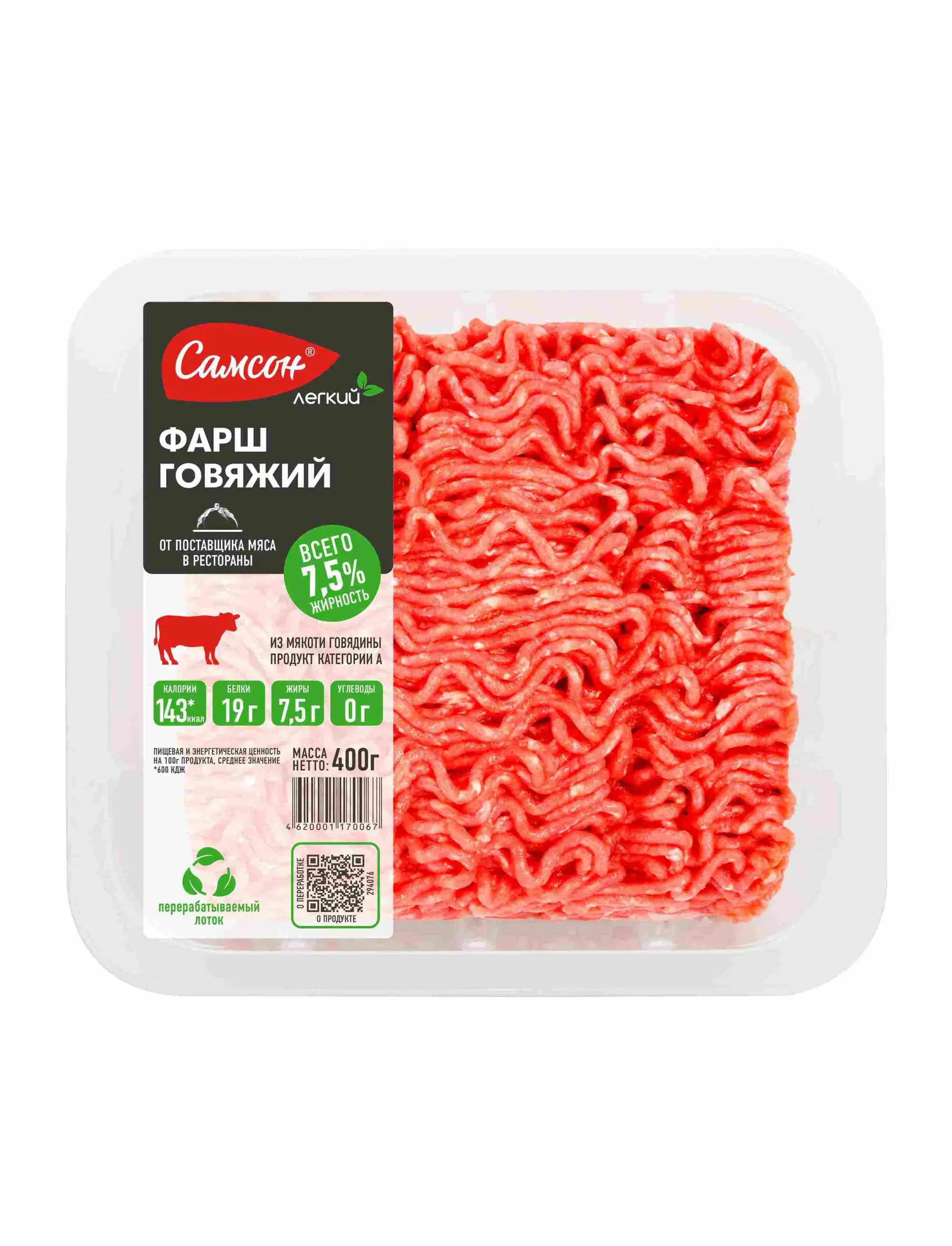 Фарш говяжий «Самсон» – идеальный выбор для тех, кто следит за своим здоровьем. Мясная продукция из фарша говядины – это вкусные тефтели и котлеты, сочные и ароматные рулеты, пироги, запеканки, ленивые голубцы, фрикадельки. Аппетитные и изысканные угощения можно подавать к завтраку, на обед или ужин.