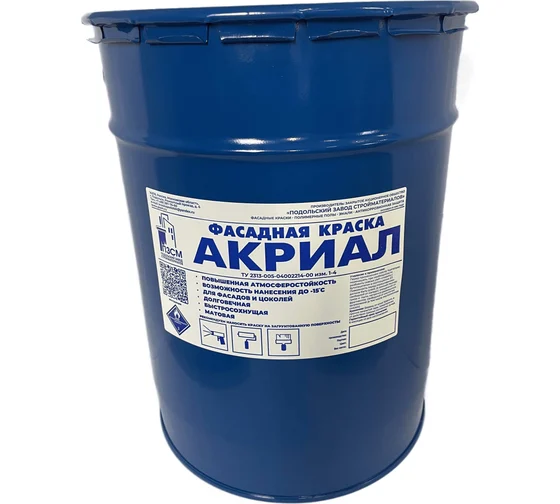 Фасадная краска кремнийорганическая Акриал предназначена для нанесения защитно-декоративных покрытий на фасады и цоколи промышленных и гражданских зданий и сооружений. Подходит для новых объектов и ремонта старых фасадов.Материал можно наносить на:бетон, пенобетон, асбестоцементные и фиброцементные плиты;цементные и акриловые штукатурки;кирпич, плоский и волнистый шифер, керамическую черепицу;загрунтованный металл, гипсокартон.Краска подходит для использования в детских садах, школах, медицинских учреждениях.