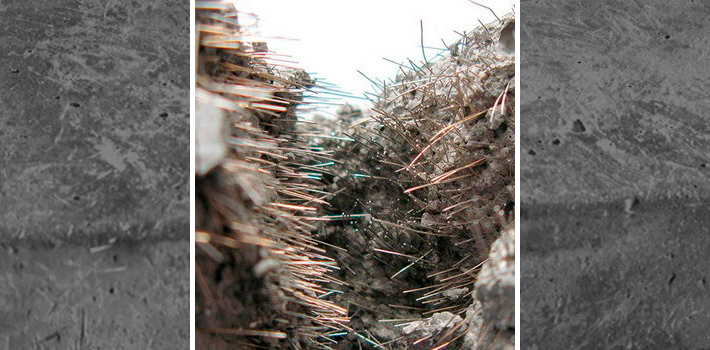 Если посмотреть на фибробетон в разрезе, то он будет представлять собой однородную конструкцию, которая по всей толщине пронизана тонким волокном, располагающимся в разных направлениях. В зависимости от того, какой вид фибры использовался, будут изменяться свойства бетона и характер включений. Фибробетон представляет собой материал, свойства которого изменяются в зависимости от качества фиброволокна. Например, стальное волокно, которое часто используется при изготовлении бетона, придает материалу повышенную прочность на растяжение и разрыв.В итоге удается получить долговечный, устойчивый к высокой температуре и щелочам материал, отличающийся высокой прочностью. Материал с таким фиброволокном называется асбестоцементом. Если же речь идет о наполнителе в виде базальтовой фибры, то перед вами материал с повышенной прочностью.