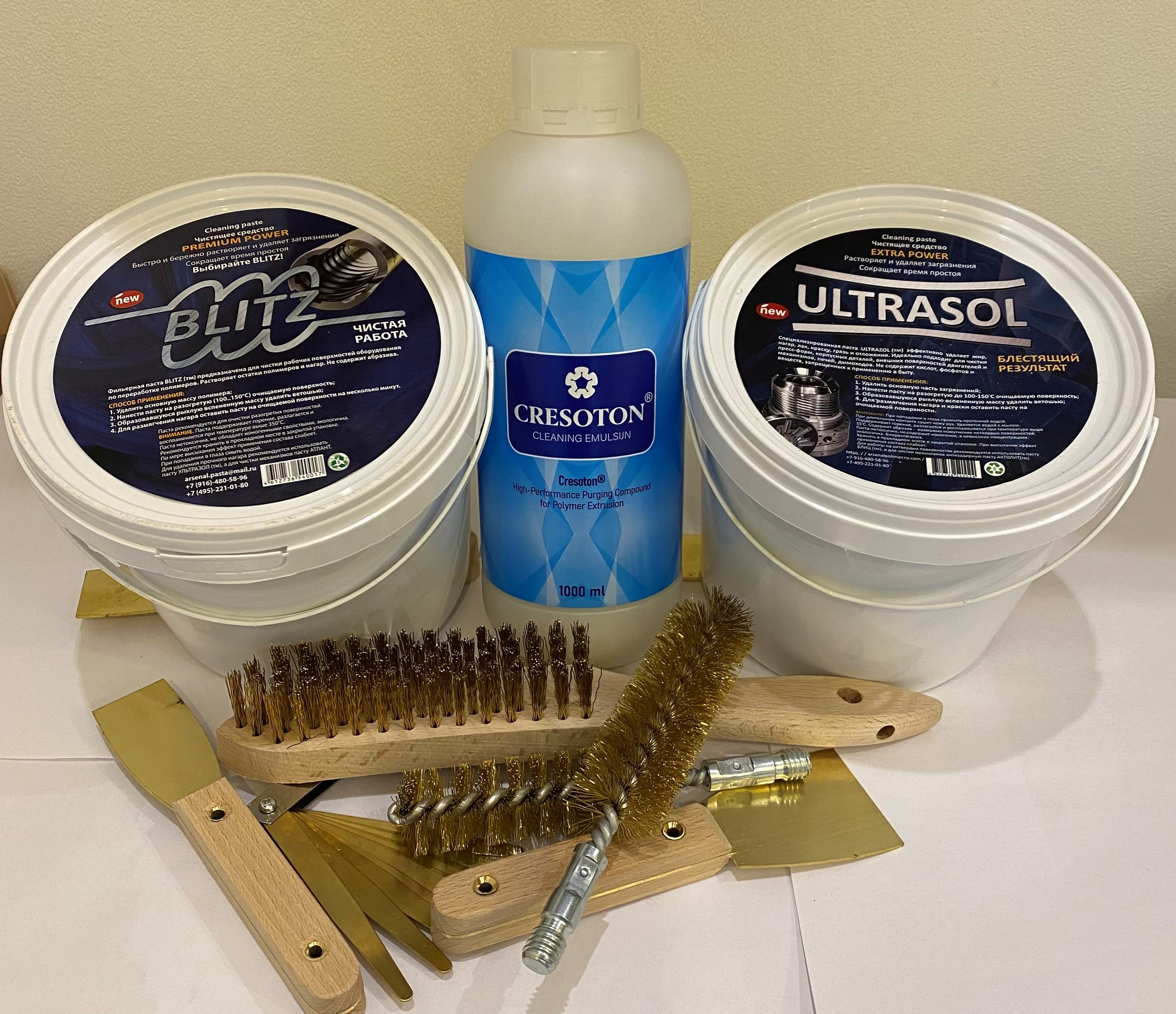 Паста «БЛИЦ» позволяет также удалять нагар, лак, краску и разнообразные отложения с твердых поверхностей, однако для более эффективной очистки таких загрязнений, а также для эффективного очищения пресс-форм, рекомендуется использовать чистящий состав «УЛЬТРАЗОЛ».