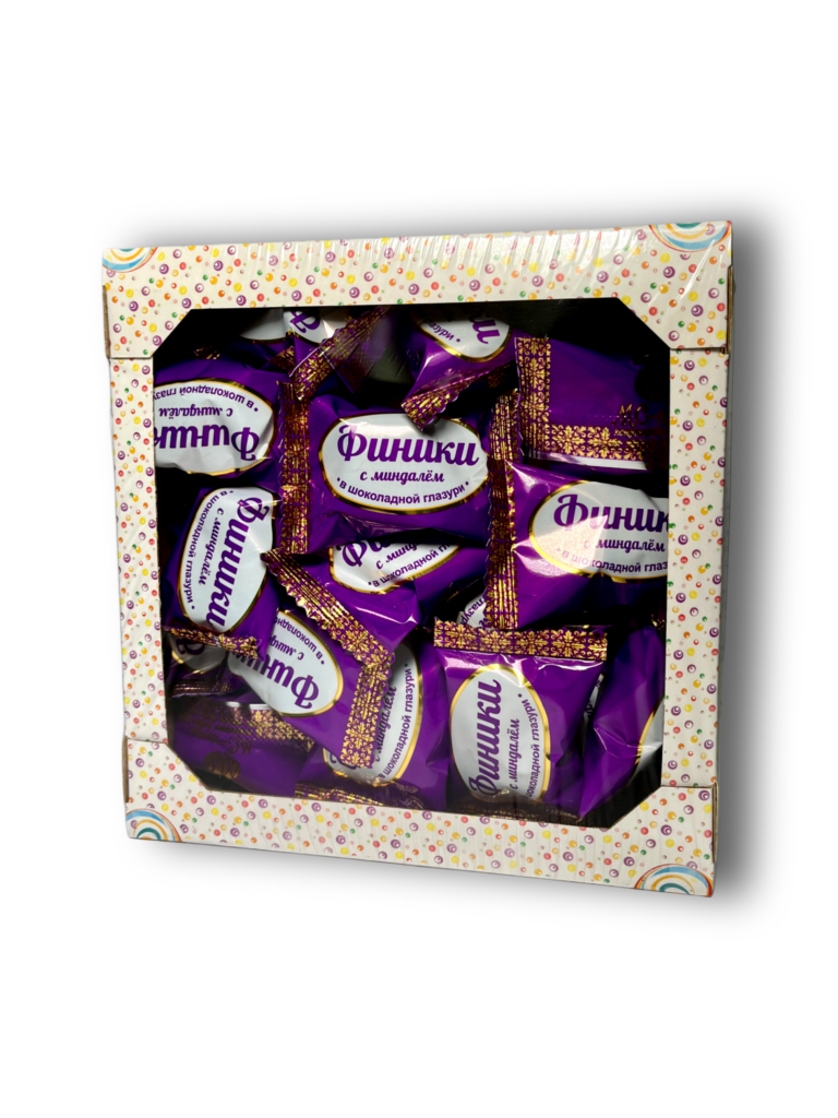 Финик, кондитерская глазурь (сахар, заменитель какао-масла лауринового типа, эмульгатор (лецитин соевый), ароматизатор «Ванилин», ядро миндаля.