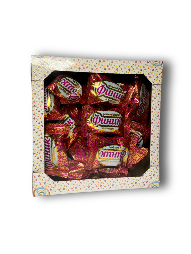 Кондитерская глазурь (сахар, заменитель какао-масла лауринового типа, эмульгатор (лецитин соевый), ароматизатор «Ванилин», финик.
