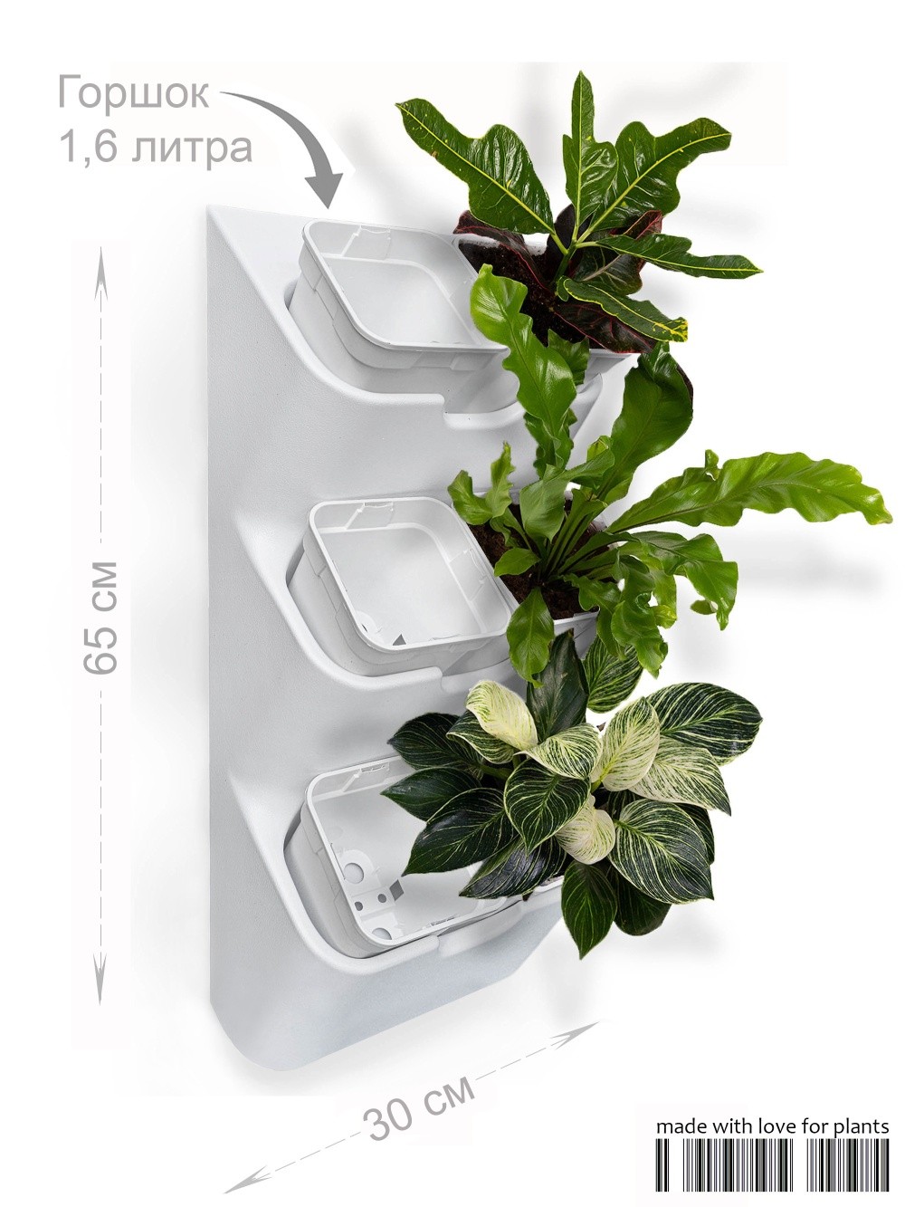 Размер модуля: ширина - 30 см глубина – 13 см высота - 65 см Вес: 1.0 кг Поставляется в индивидуальной упаковке. Комплектация 1. Крепеж; 2. Горшки квадратные, объем 1,6 литра, 13х13х13 см, цвет белый- 6 штук.