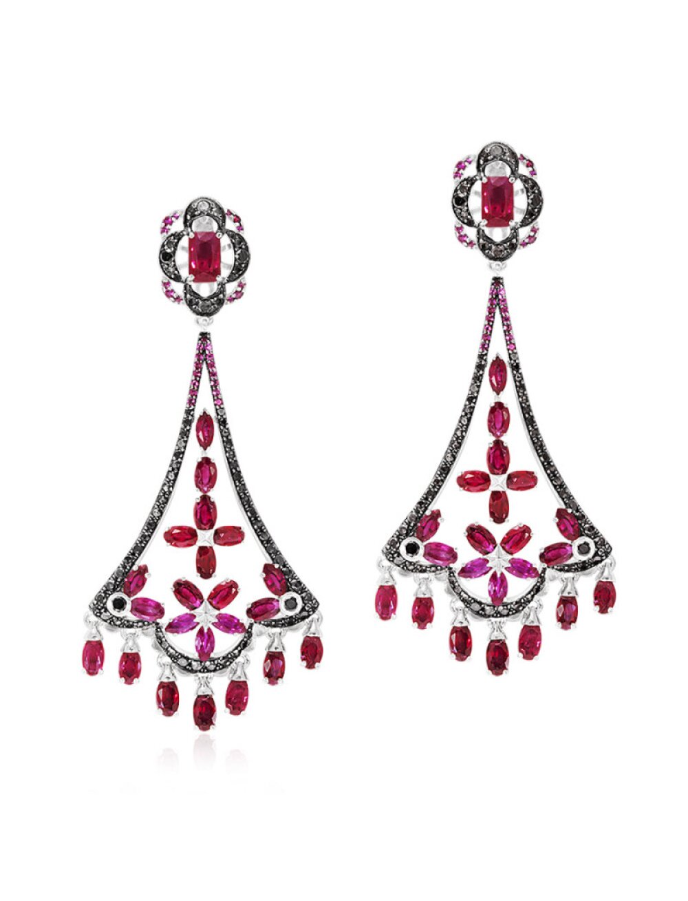 "Фламенко" серьги с рубинами и черными бриллиантами - это эксклюзивные ювелирные украшения премиум-класса, вдохновленные страстным испанским танцем. Они предназначены для создания яркого, драматичного образа, сочетая контраст огненно-красных рубинов и глубоких черных бриллиантов. Неповторимые серьги с подвижными элементами не оставят равнодушными даже самых требовательных любителей ювелирных украшений. Металл - золото 585 пробы. Вес - 17 гр. Вставки - 2 рубина октагон 2,1 карат, 44 рубина 11,01 карат, 54 рубина круг 0,46 карат, 136 цветных бриллиантов 2,34 карат.