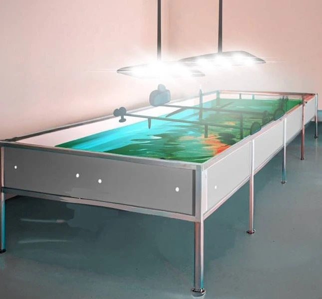 Фотобиореактор открытого интенсивного типа - это система для выращивания микроводорослей и цианобактерий, которая сочетает открытость (использование естественного света и воздуха) с интенсивностью (увеличенное освещение и подача CO2 для высокой плотности биомассы), создавая оптимальные условия для быстрого роста, в основном для получения ценных продуктов, энергии или очистки воды, и является промежуточным звеном между простыми прудами и закрытыми системами. Форма емкости - прямогугольная. Размер - диаметр 6,6 м, высота 0,5 м. Освещение - 0,1-0,2 кВт/кв.м. Освещаемый слой - 20 см. Расстояние от источника освещения до суспензии - 30 см. Перемешивание - постоянное. Выход суспензии - 5100 л/цикл. Производственный цикл - 3 суток. Производительность в месяц - 10 т. Продуктивность в 1л за цикл - 0,7-0,9 сухой биомассы, 80-90 млн клеток/мл.