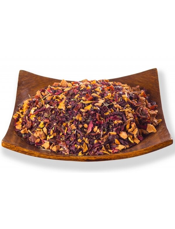 Состав: Фруктовая смесь на основе гибискуса, с шиповником, кусочками яблока, клубники, листьями клубники, лепестками роз, ароматизированная натуральными маслами.