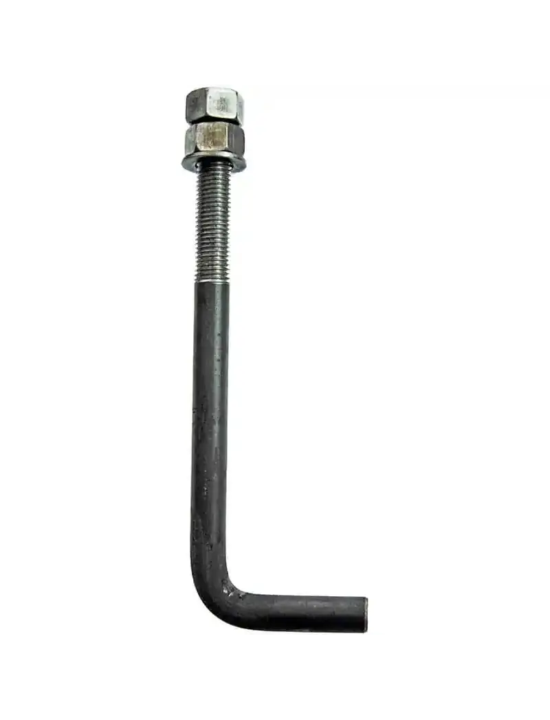 Его применяют для надежной фиксации к прочному основанию строительных конструкций, машин и механизмов, работающих в стационарном состоянии. Анкер представляет собой металлический пруток круглого сечения Г-образной формы. Его изготавливают из углеродистой или низколегированной стали. На длинном конце имеется резьба М12, используемая в комплекте с плоской шайбой и двумя гайками для крепления устанавливаемого объекта. Это крепежное изделие монтируется в фундамент на стадии заливки свежего раствора изгибом вниз. После набора твердости бетоном он становится частью монолита, который не допускает его смещения в любом направлении.
