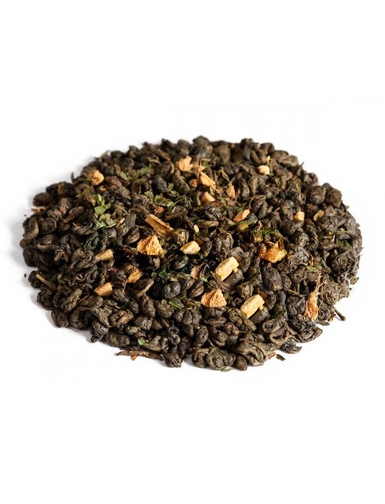 Зеленый чай Ганпаудер с добавлением кусочков имбиря и рубленого листа мяты.
