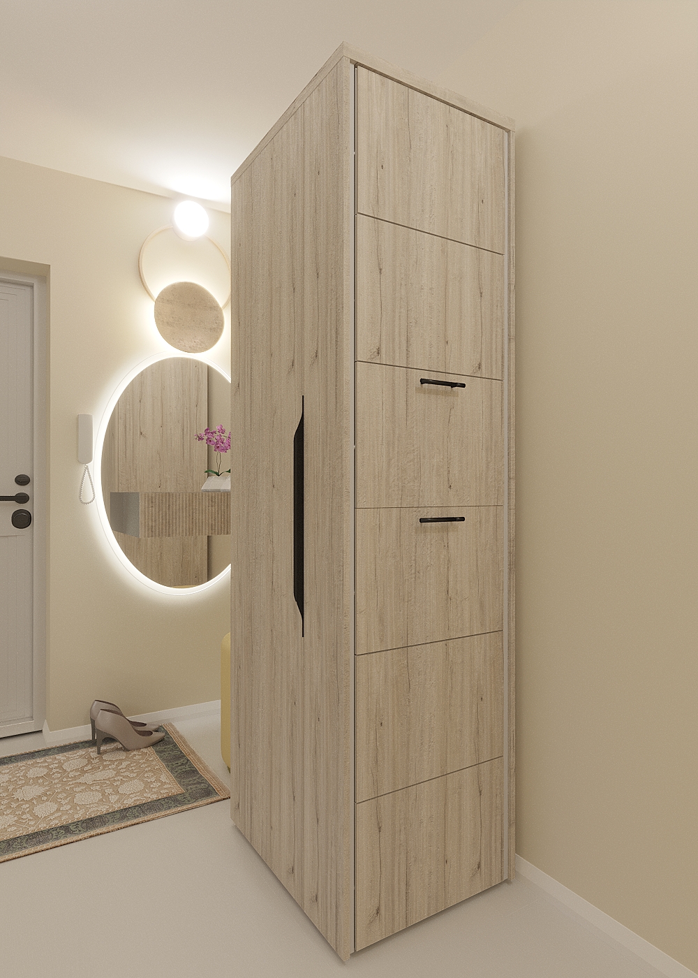 Шкаф для одежды СКАЙ 500С - поможет организовать удобное хранение одежды и обуви. Внутреннее наполнение представлено штангой для вешалок и 2 полками. Этого достаточно, чтобы практично разместить сезонные вещи и аксессуары. Обувной шкаф возможно установить как с левой, так и с правой стороны по желанию покупателя.* * Данный модуль поставляется в собранном виде. Характеристики: Материал корпуса: ЛДСП. Марки ЛАМАРТИ. Толщина ЛДСП: Крышка шкафа 32 мм, остальные детали 16 мм. Толщина кромки шкафа: 1 мм. Материал фасадов: ЛДСП Механизм открывания: синхронное открывание. Ножки: пластик, регулируемые по высоте. Материал ручки: металл, длина 60см Петли дверей: с доводчиком, на каждую дверь 4 петли. Вместимость обувного шкафа: от 12 пар.* Система лотков: листовой металлопрокат с полимерным покрытием. *** По желанию покупателя шкаф возможно доукомплектовать дополнителыми полками или выдвижным ящиком. Высота:206Ширина:69Глубина:54,5